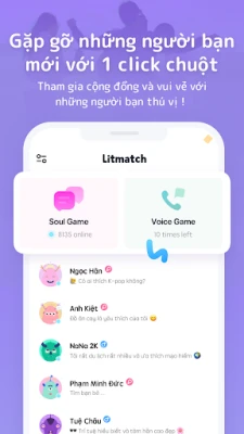 Để biến những kết nối ấy thành hiện thực, Litmatch mang đến một loạt tính năng tương tác độc đáo và cuốn hút. Hãy bắt đầu với SOUL GAME, nơi những cuộc trò chuyện văn bản tức thời mở ra cánh cửa đến sự đồng điệu, và một kết nối mới được hình thành khi cả hai bạn tìm thấy điểm chung. Tiếp đến là VOICE GAME, một trải nghiệm trò chuyện thoại ngắn gọn, giúp bạn khám phá giọng điệu, cá tính và hiểu rõ hơn về người bạn mới qua từng lời nói. Và đừng bỏ lỡ PARTY CHAT sôi động, nơi bạn có thể tham gia vào các phòng trò chuyện nhóm, chia sẻ tâm tư qua micro và nhận về sự ủng hộ nhiệt tình cùng những món quà thú vị từ cộng đồng.